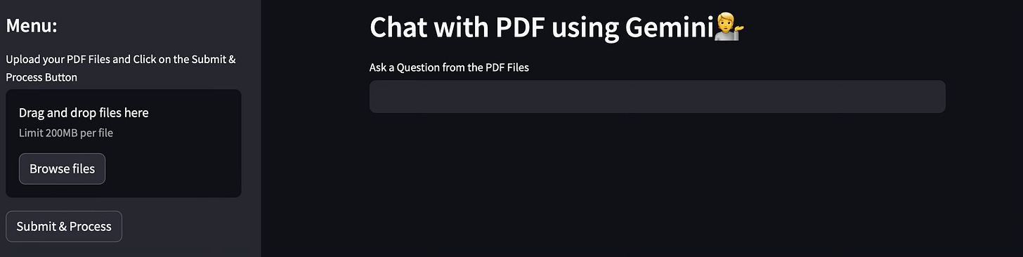 This last function sets up the Streamlit application. It configures the page, sets up a header, and creates an input field for user questions. If a question is asked, it calls `user_input` to handle the question. Additionally, it provides a sidebar for users to upload PDF files and process them. Upon clicking the "Submit & Process" button, it reads the uploaded PDFs, extracts text, splits the text into chunks, and stores the chunks in a FAISS index for later querying.